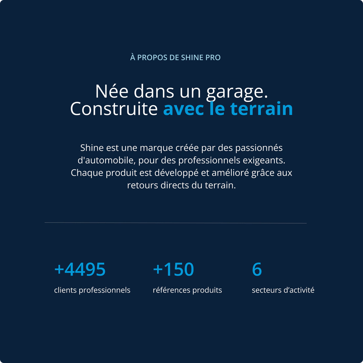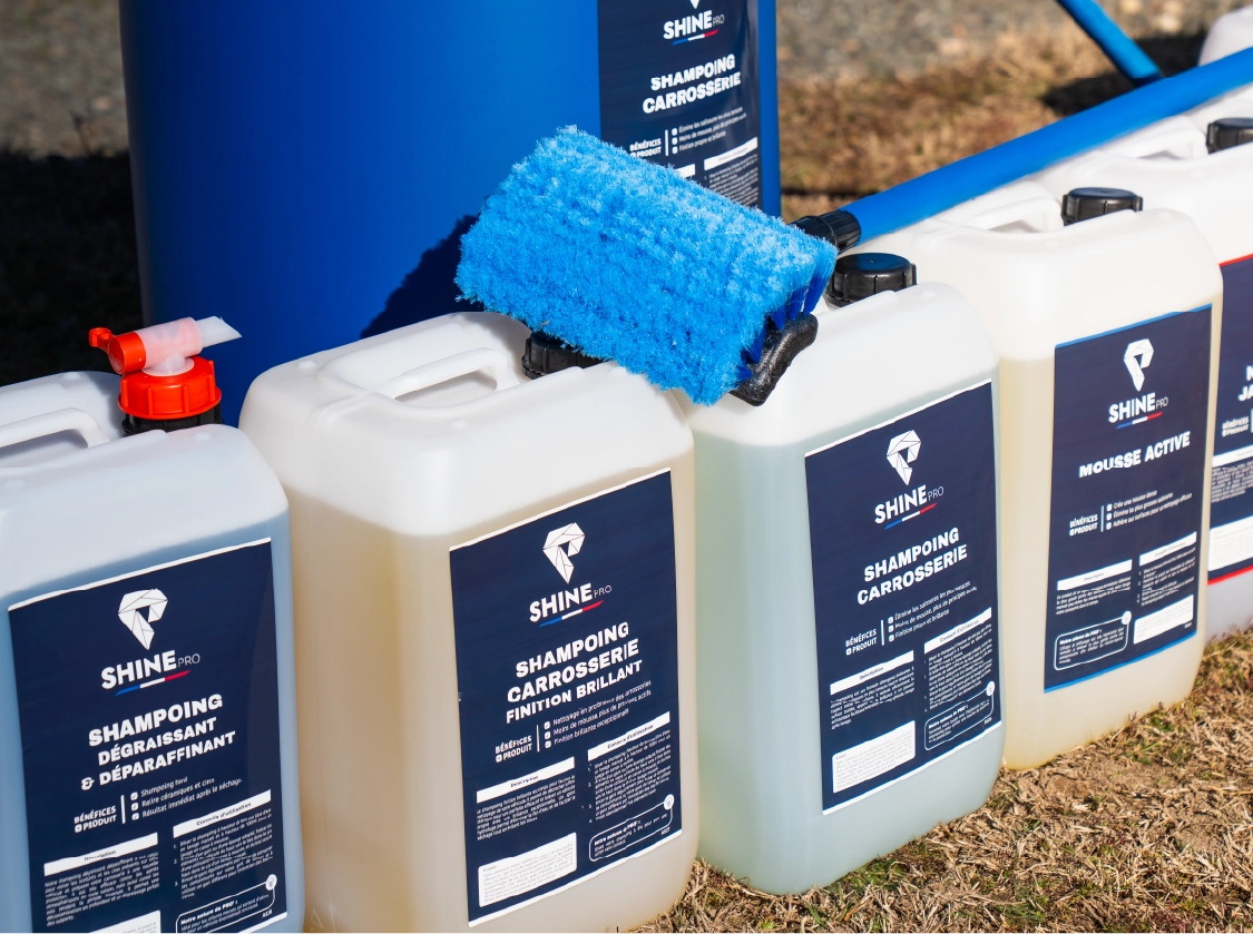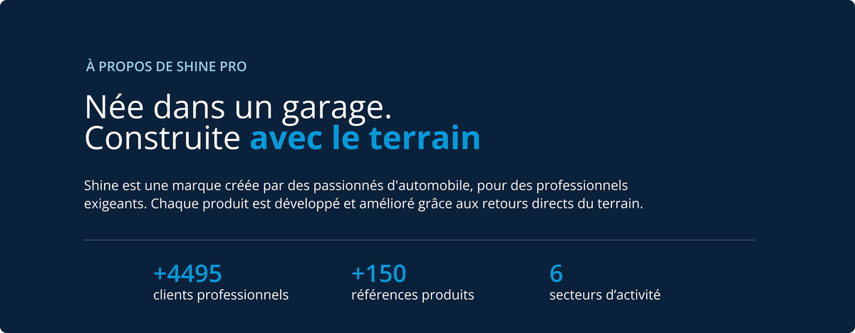 Dès le départ, nous sommes allés à la rencontre de professionnels — garages, detailers, stations de lavage — pour identifier leurs vraies contraintes : gagner du temps, obtenir un résultat impeccable, utiliser des solutions fiables et rentables. Chaque produit Shine est développé et amélioré grâce à ces retours concrets. -