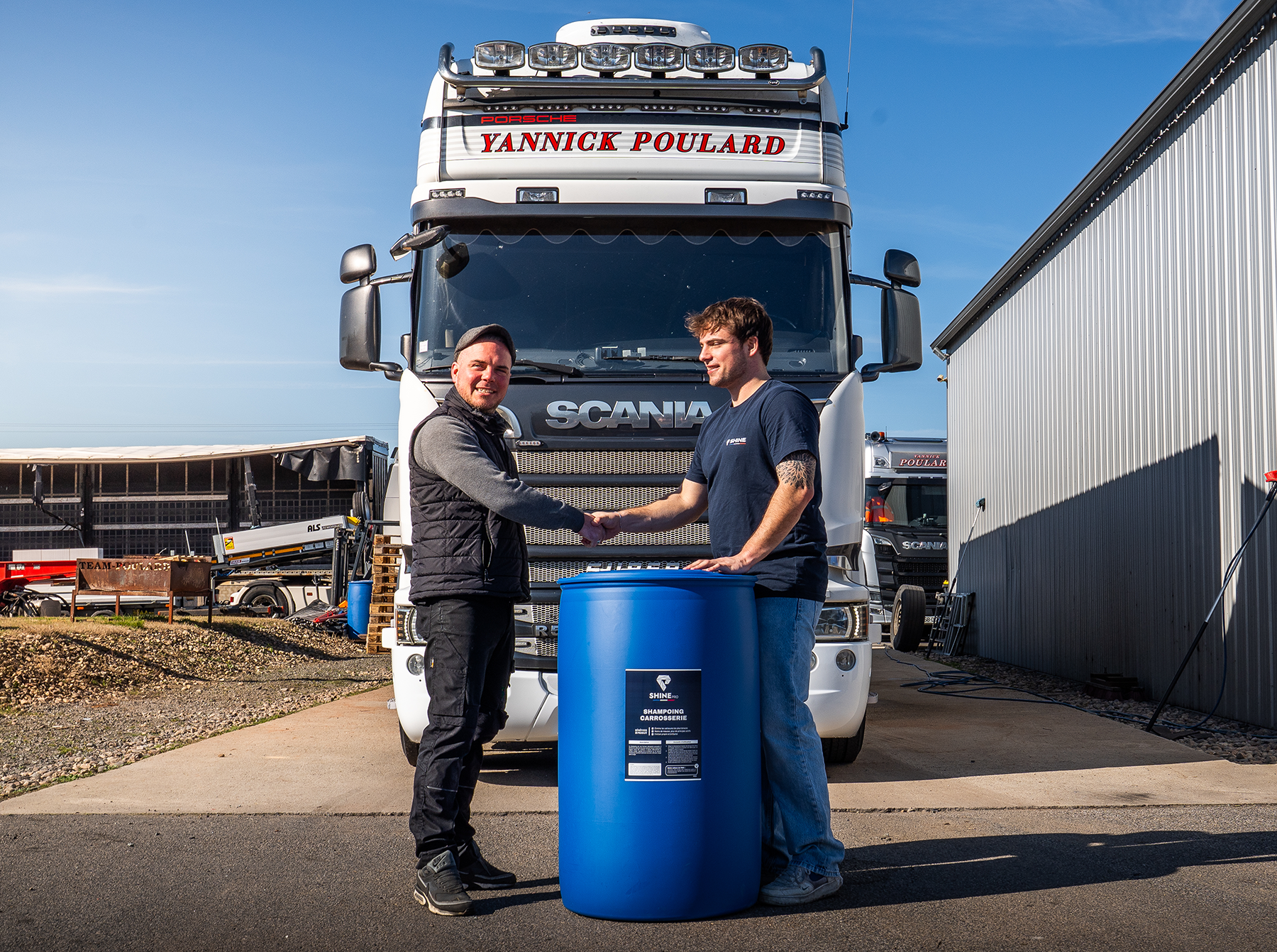 L'équipe Shine avec un client transporteur — une présence terrain au quotidien.